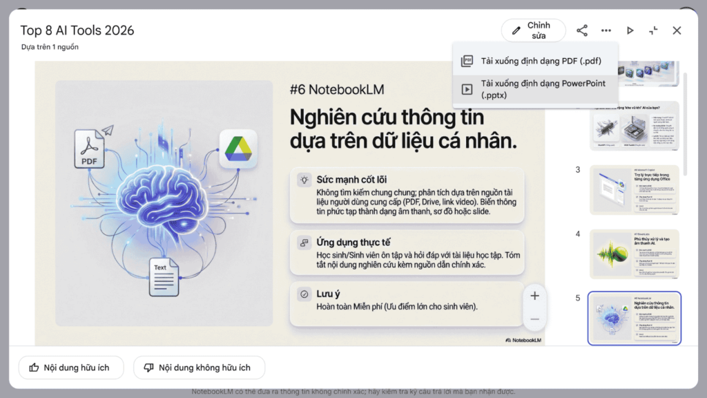 Tiếp đến là công cụ Bản trình bày. Từ các tài liệu văn bản dài, NotebookLM có thể phác thảo một bộ slide hoàn chỉnh với tiêu đề và các ý chính. Định dạng slide dọc cũng được hỗ trợ để đăng tải lên các nền tảng mạng xã hội. Tuy nhiên, công cụ này có một hạn chế thực tế là khi xuất file sang định dạng PowerPoint, các slide chỉ là những bức ảnh nguyên khối, không hỗ trợ chỉnh sửa từng dòng chữ bên trong. Mặc dù vậy, đây vẫn là phương án cực kỳ hữu ích để xây dựng cấu trúc kể chuyện hoặc lên ý tưởng thiết kế ban đầu.