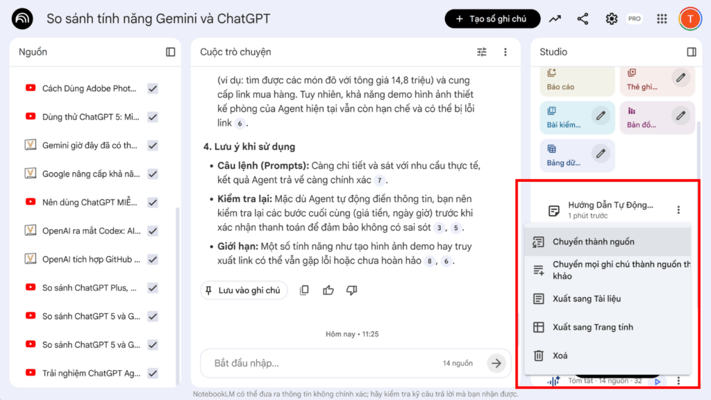 Hiện tại, NotebookLM giới hạn 50 nguồn cho bản miễn phí và 300 nguồn cho bản Pro trên mỗi notebook. Khi đạt đến giới hạn này, bạn buộc phải xóa tài liệu cũ để nhường chỗ cho tài liệu mới. Để giải quyết vấn đề này, công cụ cung cấp một cách giúp bạn gộp nhiều tài liệu thành một nguồn duy nhất. Trong quá trình trò chuyện với AI, bạn hãy yêu cầu hệ thống tổng hợp thông tin, ví dụ: “Hãy tạo một bản tổng hợp chi tiết từ 10 tài liệu hiện tại, bao gồm các luận điểm chính, dữ liệu quan trọng và những điểm tranh luận”. Sau khi AI trả lời, bạn hãy nhấp vào nút Lưu vào ghi chú, tiếp tục chọn dấu ba chấm cạnh ghi chú đó và nhấn Chuyển thành nguồn. Lúc này, bản tóm tắt đã trở thành một tài liệu gốc mới. Nhờ vậy, bạn có thể xóa 10 tài liệu ban đầu để giải phóng không gian, trong khi phần thông tin cốt lõi vẫn được giữ lại để AI tham chiếu cho các cuộc trò chuyện sau. Thêm vào đó, nền tảng còn cho phép trích xuất trực tiếp phần ghi chú đó sang Google Docs hoặc Google Sheets vô cùng tiện lợi.