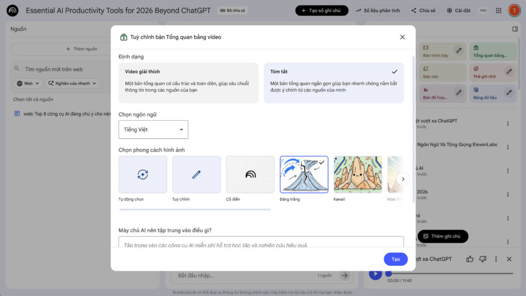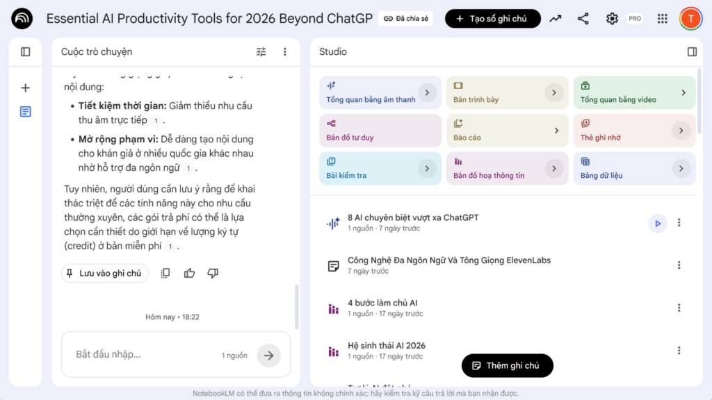 NotebookLM đã chứng minh được sự phát triển vượt bậc từ một công cụ đọc tài liệu trở thành một trợ lý đắc lực trong việc xử lý và định dạng thông tin. Việc thiết lập quy trình chuẩn từ khâu quản lý nguồn dữ liệu, cho đến khâu tận dụng không gian Studio sẽ giúp biến hàng tá tài liệu khô khan thành các thành phẩm đa dạng. Miễn là người dùng hiểu rõ ranh giới về sự sáng tạo của công cụ này, đây chắc chắn là một giải pháp công nghệ mạnh mẽ để tối ưu hóa hiệu suất làm việc hàng ngày.