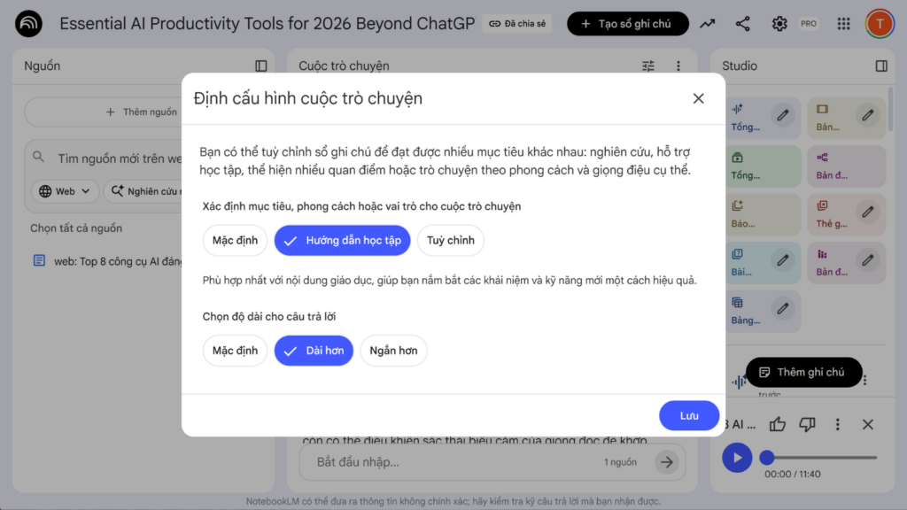 Thông thường, người dùng hay yêu cầu AI tóm tắt hoặc giải thích và nhận lại một đoạn văn bản dài để đọc. Nếu muốn thay đổi cách tiếp cận thông tin, bạn có thể mở phần cài đặt ở góc trên bên phải khung chat và chuyển mục tiêu trò chuyện từ Mặc định sang Hướng dẫn học tập. Ở chế độ này, NotebookLM sẽ hoạt động giống như một người hướng dẫn. Thay vì chỉ cung cấp thông tin một chiều, AI sẽ chia nhỏ các chủ đề, giải thích từng phần và đặt ra các câu hỏi mở để kiểm tra mức độ hiểu của bạn trước khi đi tiếp. Đây là một cách tiếp cận phù hợp cho những ai cần ôn tập hoặc muốn ghi nhớ nội dung của các tài liệu chuyên ngành.