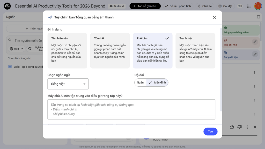 Khi tạo Tổng quan bằng âm thanh, nếu chỉ nhấn nút tạo theo thói quen, bạn có thể bỏ qua ba định dạng âm thanh khác nằm phía trên hộp lệnh. Mặc định hệ thống chọn Tìm hiểu sâu, nhưng các định dạng còn lại cũng có những chức năng riêng biệt. Nếu bạn cần nắm bắt thông tin nhanh, hãy chọn Tóm tắt để có một bản tổng hợp ngắn gọn. Nếu bạn đang muốn rà soát lại kế hoạch kinh doanh hoặc bài nghiên cứu của mình, chế độ Phê bình sẽ yêu cầu các MC AI tìm kiếm những điểm thiếu sót hoặc phương pháp luận chưa chặt chẽ trong tài liệu. Ngoài ra, chế độ Tranh luận sẽ để AI đóng vai hai phe đối lập, giúp bạn nhìn nhận vấn đề từ nhiều góc độ khác nhau thay vì chỉ nghe một bản tóm tắt trung lập. Tuy nhiên, người dùng cũng cần lưu ý rằng đôi khi AI ở chế độ Phê bình có thể đưa ra những đánh giá khắt khe so với thực tế của tài liệu.