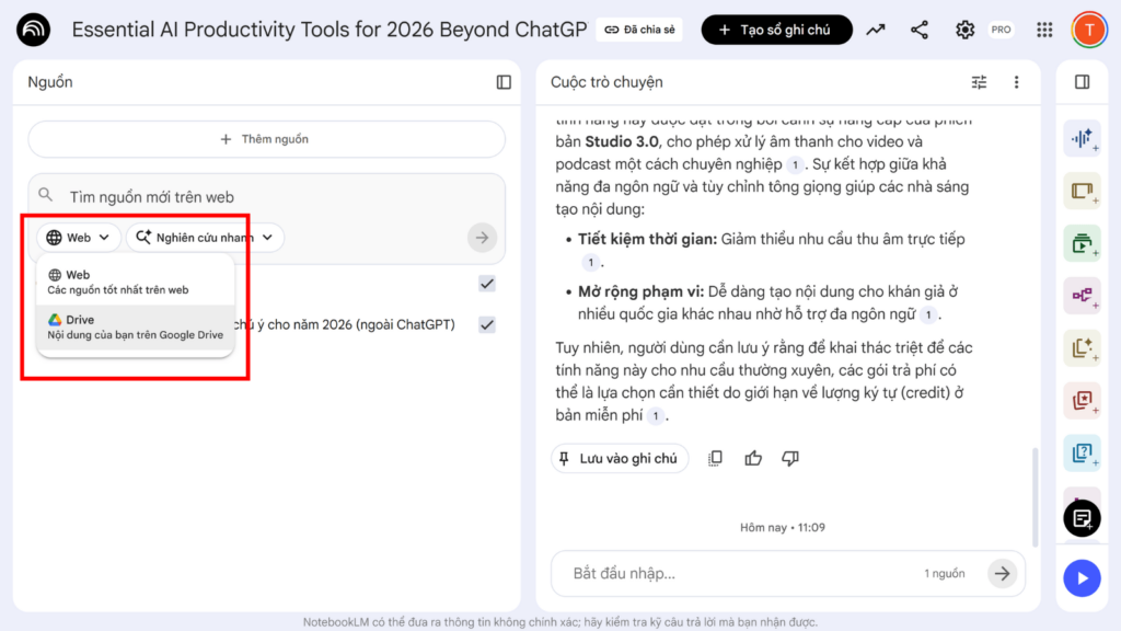 Trong tìm kiếm nguồn của NotebookLM, thông thường sẽ có biểu tượng chữ “Web” để AI tìm kiếm thông tin trên internet. Khi nhấp vào mũi tên thả xuống bên cạnh, bạn sẽ thấy thêm tùy chọn Drive. Tính năng này cho phép NotebookLM kết nối trực tiếp với tài khoản Google Drive của bạn. Thay vì phải mở tab mới, tải file xuống máy tính rồi mới tải lên NotebookLM, bạn chỉ cần gõ tên tài liệu, bảng tính hoặc bài thuyết trình cần tìm. Hệ thống sẽ tự động quét và cho phép bạn thêm file đó làm nguồn nhanh chóng. Thao tác này giúp rút ngắn đáng kể các bước thực hiện trung gian, giúp quá trình làm việc liền mạch hơn.