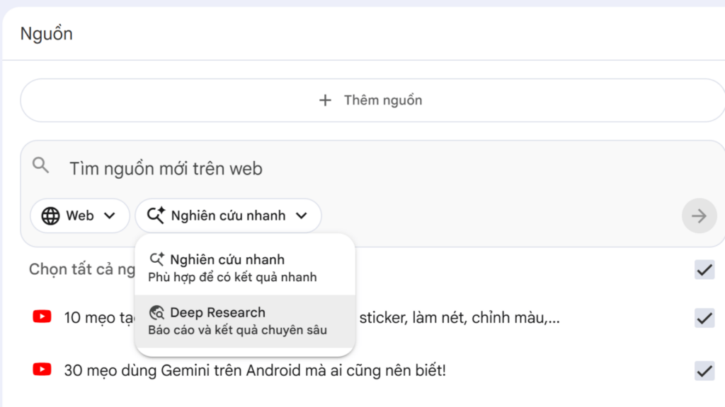 Bên cạnh Nghiên cứu nhanh, NotebookLM còn cung cấp thêm công cụ Deep Research trên Web. Điểm khác biệt cốt lõi là Nghiên cứu nhanh chỉ đưa ra danh sách các nguồn để người dùng tự chọn lọc và đọc, trong khi Deep Research sẽ tự động đọc các nguồn đó, tổng hợp lại và viết thành một bản báo cáo hoàn chỉnh để đưa trực tiếp vào làm tài liệu gốc. Dù tính năng này khá tiện lợi, nhưng trên thực tế lại không hiệu quả bằng việc tự chọn lọc nguồn thủ công qua Nghiên cứu nhanh, hoặc sử dụng tính năng Deep Research trên các chatbot như Gemini, ChatGPT hay Claude.