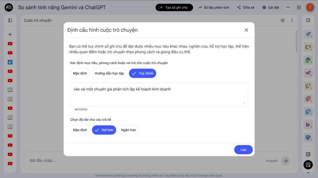 Chuyển sang cột ở giữa, đây là không gian trò chuyện để tương tác với dữ liệu. Tính năng đáng chú ý nhất tại đây là cửa sổ Cấu hình trò chuyện. Đối với các tác vụ quan trọng, một câu lệnh hướng dẫn tùy chỉnh luôn cần thiết để AI hiểu rõ mục tiêu cuối cùng, ví dụ như thiết lập hệ thống luôn đóng vai trò một chuyên gia phân tích lập kế hoạch kinh doanh. Sau khi trích xuất được những thông tin giá trị, người dùng có thể lưu lại thành các ghi chú và chuyển đổi chúng thành một nguồn tài liệu mới nhằm định hình cho các câu trả lời sau này. Trong quá trình hội thoại, tính năng Hướng dẫn về nguồn sẽ tự động gợi ý các câu hỏi đào sâu vấn đề dựa trên nội dung vừa tải lên.