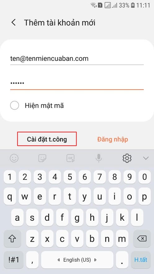 Bước 2: Bạn nhập thông tin tài khoản email và mật khẩu tương ứng và bấm chọn Cài đặt thủ công
