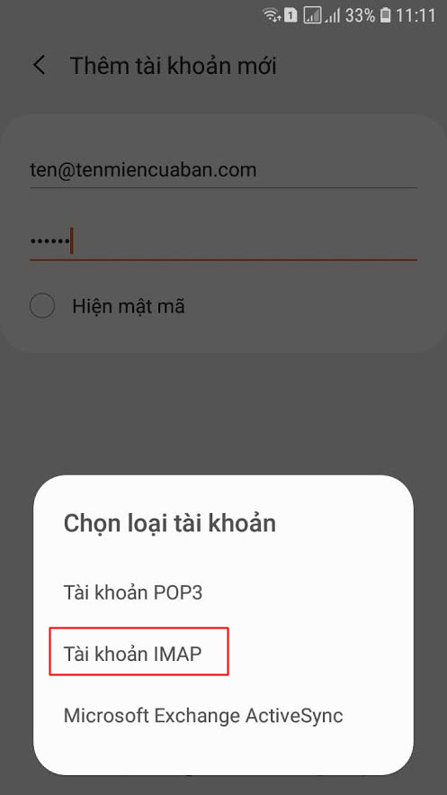 Bước 3: Tùy theo nhu cầu sử dụng, bạn lựa chọn giữa 2 loại giao thức IMAP hay POP (bạn nên lựa chọn giao thức kết nối IMAP để sử dụng trên thiết bị di động).