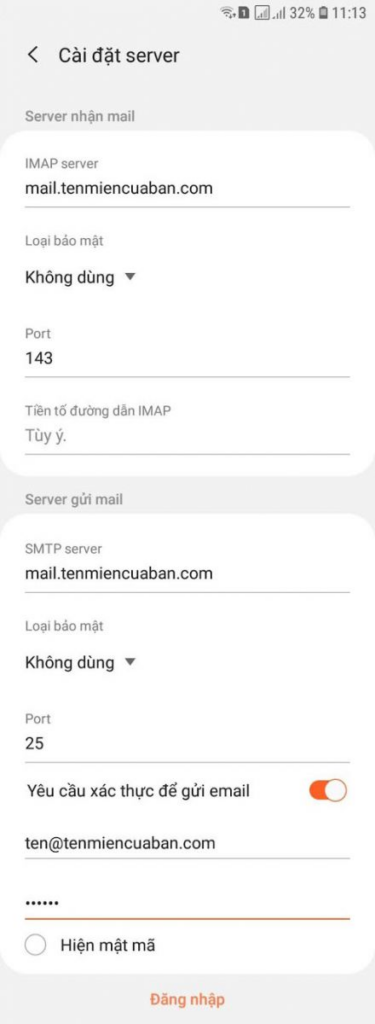 IMAP server: máy chủ nhận mail (thường là mail.tenmiencuaban.com)