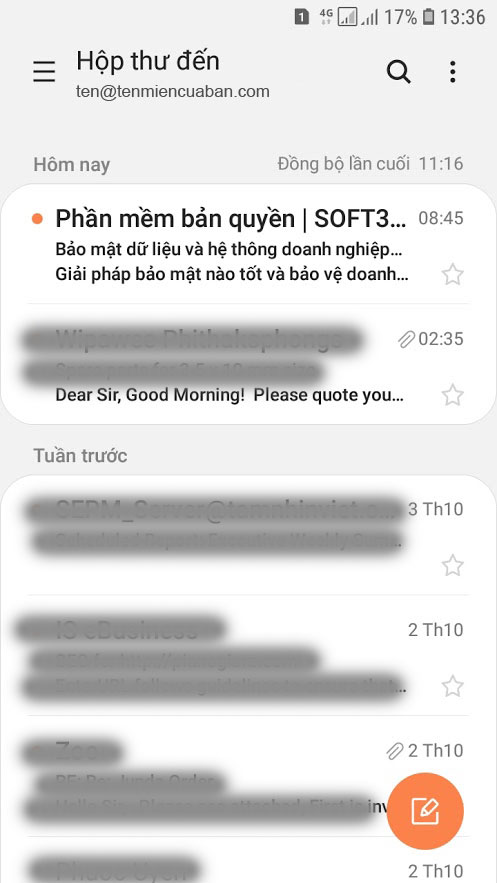 Sau đó nhấn ĐĂNG NHẬP (SIGN IN) để hoàn tất quá trình cài đặt. Nếu thông tin nhập đúng thì App sẽ hiển thị giao diện để bạn có thể xem, gởi và nhận email.