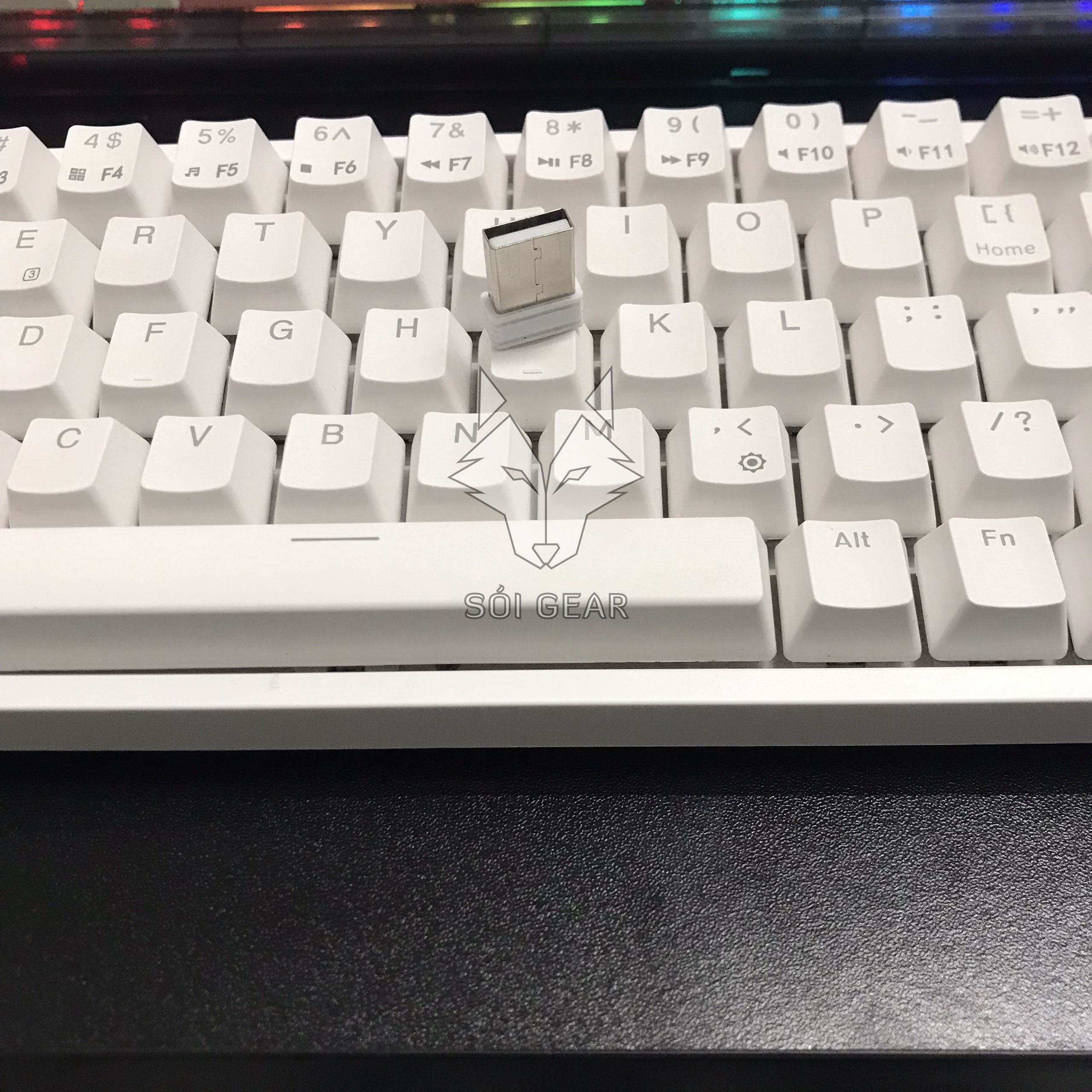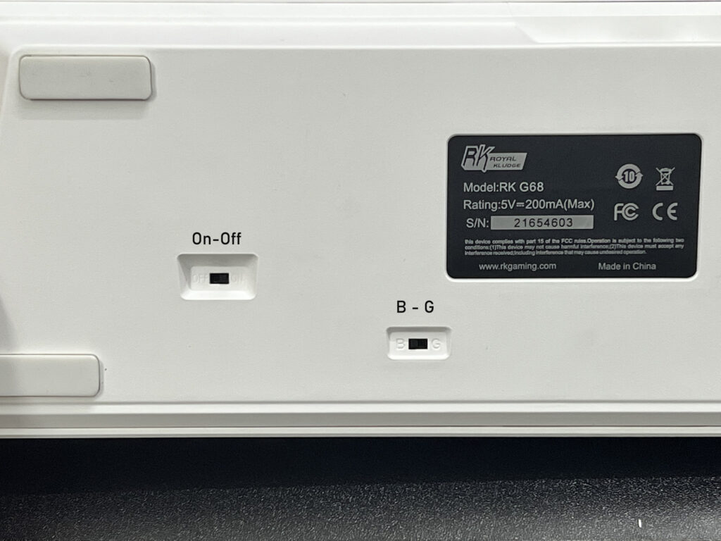 ◼️ Kết nối 2.4G: Bật công tắc bàn phím On, sau đó gạt công tắc kết nối sang chữ “G”. Khi đó phím P trên bàn phím Royal Kludge RK G68 RGB sẽ nhấp nháy, cắm USB receiver 2.4G vào thiết bị cần sử dụng.